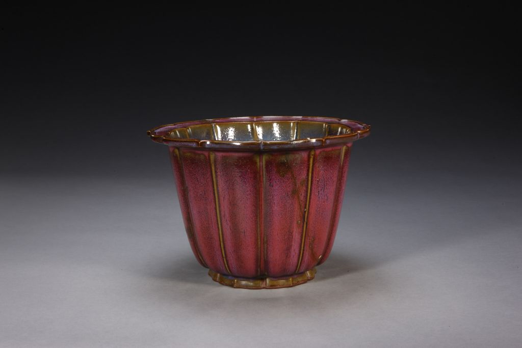 美丽的釉色同具有微弱透光性的乳光状态结合在一起,赋予钧瓷一种莹润幽雅、美丽含蓄的光泽。钧窑花盆有长方、六方、菱花、葵花、海棠、仰钟式等。尽管形式多样,但都实用美观。菱花式花盆通体披挂的玫瑰紫色釉与盆体边棱部位呈现的茶黄色相互映衬,犹如夕阳与晚霞辉映,给人以美的遐想。