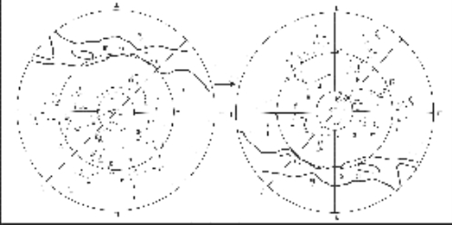当帝星在北极之下,可以图中A 点示意,诸星方位易于理解;当帝星在北极之上,实则表示帝星从A 点运行到越过北极点的另一互补经线圈上,如B点所示,此时因为观察点帝星已经变化,所以左右方位也正好互易。