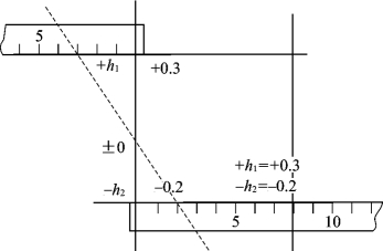 确定零点也可以用图解法,如图1.5所示。方法是用尺在各角点上标出挖填施工高度的相应比例,用尺相连,与方格相交,交点即为零点位置。将相邻的零点连接起来,即为零线,它是确定方格中挖方与填方的分界线。在平整场地施工时,将零线确定于地面上,作为施工时的挖填分界线。