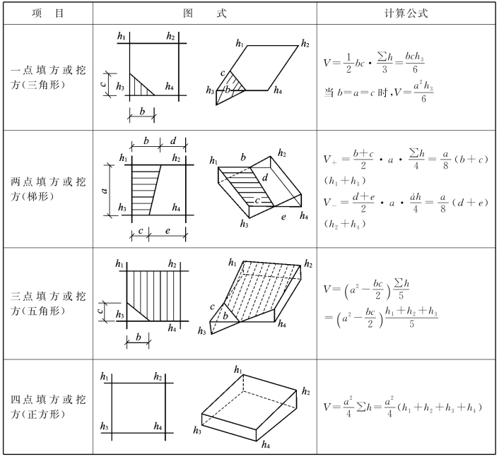 注:①a——方格网的边长,m;b、c、d、e——零点到一角的边长,m;h1、h2、h3、h4——方格网四角点的施工高程(用绝对值代入),m;Σh——填方或挖方施工高程的总和(用绝对值代入),m;V——挖方或填方体积,m3