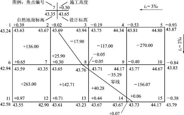 角点的施工高度为角点设计标高与自然地面标高之差,是以角点设计标高为基准的挖方或填方的施工高度。各方格角点的施工高度按下式计算: