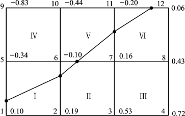 (2)计算零点位置。从图1.8中可知,1—5、2—6、6—7、7—11、11—12五条方格边两端的施工高度符号不同,说明此方格边上有零点存在。由公式1.10求得: