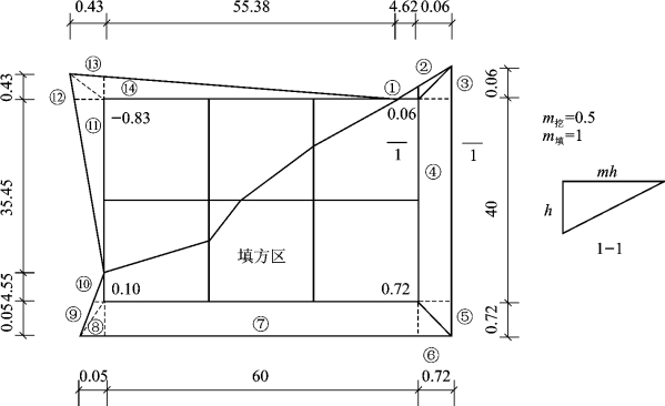 【例1.1】 某建筑场地方格网如图1.7所示,方格边长为20m×20m,填方区边坡坡度系数为1.0,挖方区边坡坡度系数为0.5,试用公式法计算挖方和填方的总土方量。