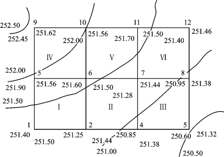 (3)计算方格土方量。方格Ⅲ、Ⅳ底面为正方形,土方量为: