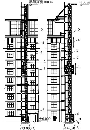 目前,在高层建筑施工中常采用人货两用的建筑施工电梯,它的吊笼装在井架外侧,沿齿条式轨道升降,附着在外墙或其他建筑物结构上,可载重货物1.0~1.2t,亦可容纳12~15人,其高度随着建筑物主体结构施工而接高,可达100m,如图3.17所示。它特别适用于高层建筑,也可用于高大建筑、多层厂房和一般楼房施工中的垂直运输。