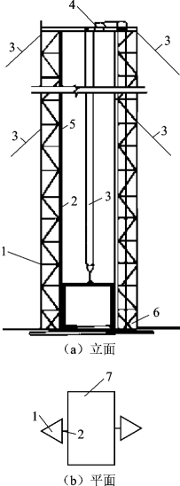 1—立杆;2—导轨;3—缆风绳;4—天轮;5—吊盘停车安全装置;6—地轮;7—吊盘
