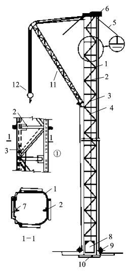 1—立柱;2—平撑;3—斜撑;4—钢丝绳;5—缆风绳;6—天轮;7—导轨;8—吊盘;9—地轮;10—垫木;11—摇臂拔杆;12—滑轮组