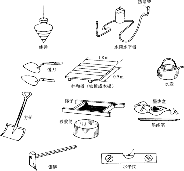 拌和板、筛子、铁铲、水桶——搅拌砂浆用,每组各一个;