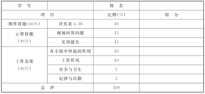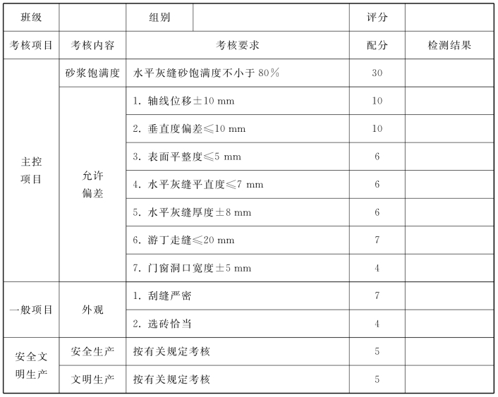 由任课老师按表3.18中所示考核内容进行打分。砖瓦工工种实训成绩评定见表3.19。