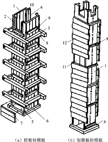 1—内拼板;2—外拼板;3—柱箍;4—梁缺口;5—清理孔;6—木框;7—盖板;8—拉紧螺栓;9—拼条;10—三角木条;11—浇筑孔;12—短横板