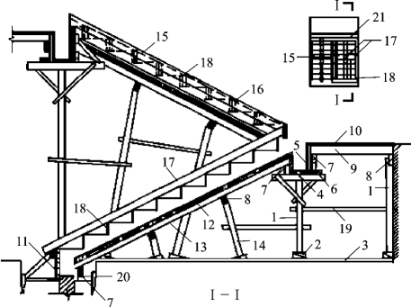 1—支柱(顶撑);2—木楔;3—垫板;4—平台梁底板;5—侧板;6—夹板;7—托木;8—杠木;9—木楞;10—平台底板;11—梯基侧板;12—斜木楞;13—楼梯底板;14—斜向顶撑;15—外帮板;16—横档木;17—反三角板;18—踏步侧板;19—拉杆;20—木桩;21—平台梁模
