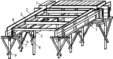 1—楼板模板;2—梁侧模板;3—楞木;4—托木;5—杠木;6—夹木;7—短撑木;8—杠木撑;9—顶撑
