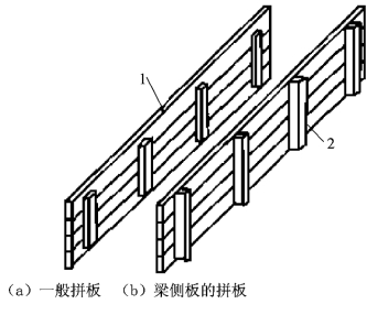 木模板及其支架系统一般在加工厂或现场木工棚制成元件,然后再在现场拼装。图4.1所示为基本元件之拼板的构造。