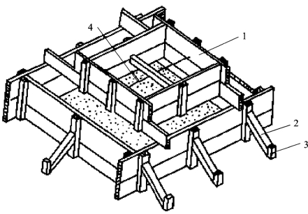 基础的特点是高度不大但体积较大。基础模板一般利用地基或基槽(坑)进行支撑。如土质良好,基础的最下一级可不用模板,直接原槽浇筑。安装时,要保证上下模板不发生相对位移,如为杯形基础,则还要在其中放入杯口模板。图4.2所示为阶梯形基础模板。