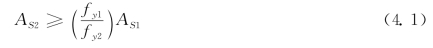 设计中所用钢筋强度为fy1,钢筋总面积AS1;代换后钢筋强度为fy2,钢筋总面积为AS2。应使代换前后钢筋的总强度相等。即