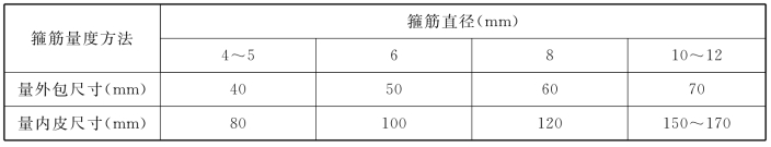 箍筋调整值,即为弯钩增加长度和弯曲调整值两项之差或和,根据箍筋量外包尺寸或内皮尺寸确定,如表4.6所示。