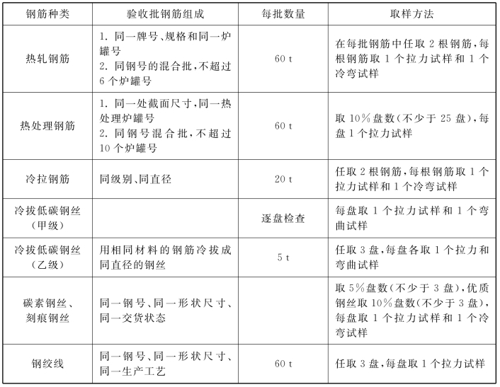 钢筋、钢丝、钢绞线应成批验收,应按有关标准的规定抽取试样做力学性能试验和冷弯试验,试验合格后方可使用。做试验时的抽样方法应按相应标准所规定的规则抽取,如表4.4所示。若有一个试样一项试验指标不合格,则另取双倍数量试样进行复检,若仍有一个试样不合格,则该批钢筋不予验收。