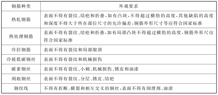 钢筋混凝土结构中所用的钢筋都应有出厂质量证明或试验报告单,每捆(盘)钢筋均应有标牌。进场时应按批号及直径分批验收。验收的内容包括查对标牌、外观检查等。外观检查应满足表4.3要求。