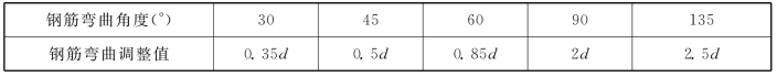 钢筋弯曲后的特点:在弯曲处内皮收缩、外皮延伸、轴线长度不变,钢筋弯曲段的外包尺寸大于轴线长度,二者之间存在一个差值,称量度差值。根据理论推算并结合实践经验,钢筋弯曲调整值见表4.5。