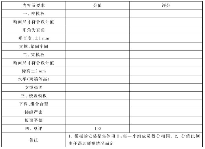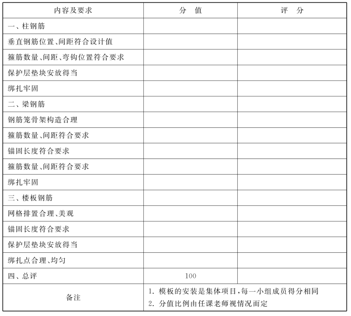 模板安装、钢筋绑扎安装评分方法详见表4.14和表4.15,现场回答的问题来自教材的有关内容,实训报告的编写可参照有关实习报告的编写方法。因操作技能的实训是集体项目,讲究分工与配合,小组内成员得分相同,“在小组中所起作用”指小组每个成员所担负的分工职责完成情况。