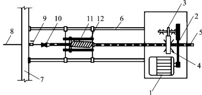 1—电动机;2—皮带;3—齿轮;4—齿轮螺母;5—螺杆;6—顶杆;7—台座横梁;8—钢丝;9—锚固夹具;10—张拉夹具;11—弹簧测力针;12—滑动架
