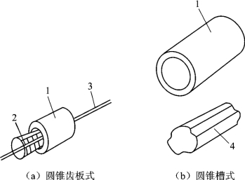 锥销夹具可分为圆锥齿板式夹具和圆锥槽式夹具,由钢质圆柱形套筒和带有细齿(或凹槽)的锥销组成,如图5.4所示。锥销夹具既可用于固定端,也可用于张拉端,具有自锁和自锚能力。