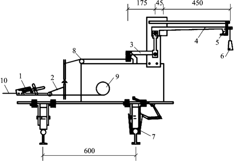 1—钳式张拉夹具;2—钢丝绳;3、4—杠杆;5—断电器;6—砝码;7—夹轨器;8—导向轮;9—卷扬机;10—钢丝