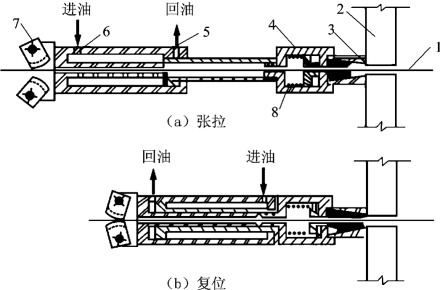1—钢筋;2—台座;3—穿心式夹具;4—弹性顶压头;5、6—油嘴;7—偏心式夹具;8—弹簧