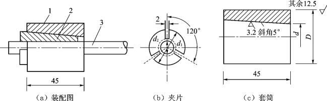 钢筋锚固常用圆套筒三片式夹具,由套筒和夹片组成(图5.6)。