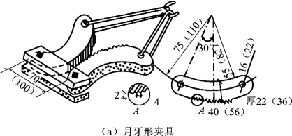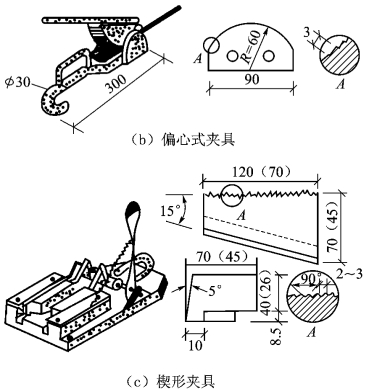 张拉夹具是夹持住预应力筋后,与张拉机械连接起来进行预应力筋张拉的机具。常用的张拉夹具有月牙形夹具、偏心式夹具、楔形夹具等,如图5.7所示,适用于张拉钢丝和直径16mm以下的钢筋。