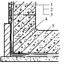 1—结构墙体;2—卷材防水层;3—卷材保护层;4—卷材加强层;5—结构底板