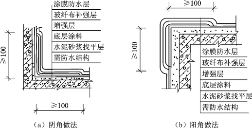转角处均应使用玻璃纤维布补强。阳角由于厚涂困难,一定要做成半径大于10mm的圆角;阴角应做成50mm左右的圆角,见图8.30。