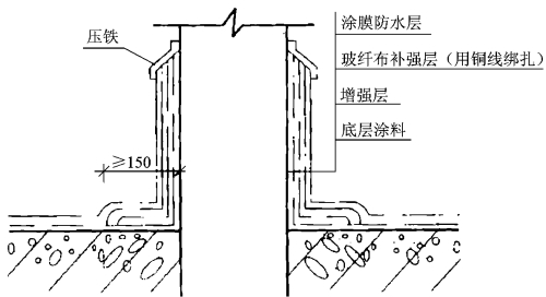 聚乙烯塑料管黏结性差,可先用砂纸把管子光面打毛,并涂刷正确的底层涂料。底层涂料应向厂家咨询。金属管必须去油、除锈。同时也应涂刷正确的底层涂料。底层涂料固化后,涂一道增强层固化后,再做玻璃纤维布增强涂抹。然后再按涂膜防水层做法涂布。见图8.29。
