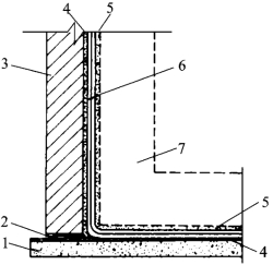 1—混凝土垫层;2—干铺油毡;3—永久性保护墙;4—找平层;5—保护层;6—卷材防水层;7—需防水的结构