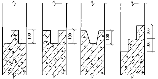 施工缝是防水薄弱部位之一,应不留或少留。底板的混凝土应连续浇筑。墙体上不得留垂直的施工缝,且垂直的施工缝应与变形缝统一考虑。最低水平施工缝距底板面应不小于300mm,并避免设在墙板承受弯矩或剪力最大的部位。施工缝的接缝断面可做成不同的形状,见图8.31。
