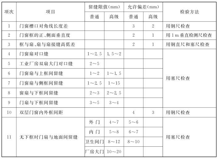 表9.2 木门窗安装的留缝限值、允许偏差和检验方法