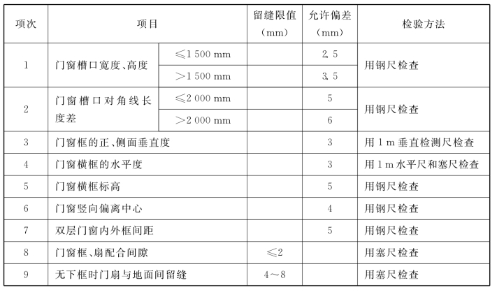 表9.3 钢门窗安装的留缝限值、允许偏差和检查方法