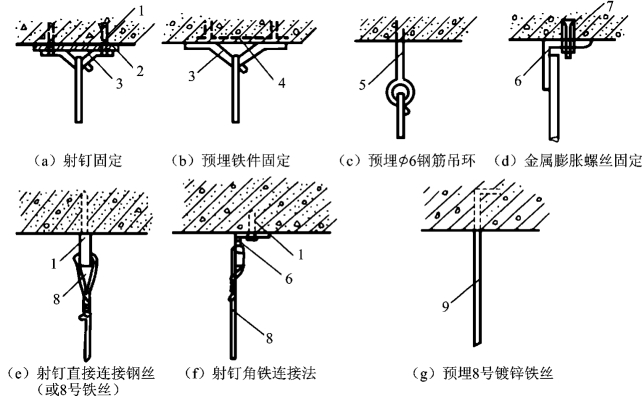 1—射钉;2—焊板;3—φ10钢筋吊环;4—预埋钢板;5—φ6钢筋;6—角钢;7—金属膨胀螺丝;8—铝合金丝(8号、12号、14号);9—8号镀锌铁丝