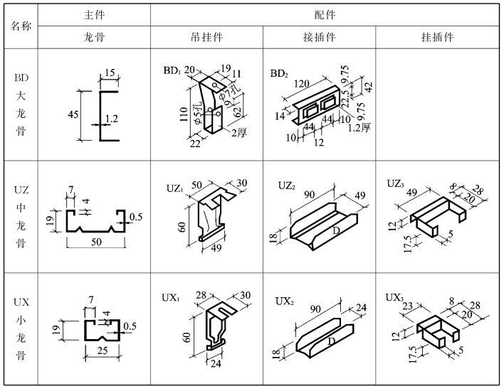 U45型系列吊顶轻钢龙骨的主件及配件见表9.6。U形龙骨吊顶安装示意图如图9.8所示。T形铝合金龙骨安装如图9.9所示。