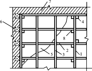 1—大龙骨;2—小龙骨;3—横撑龙骨;4—吊筋;5—罩面板;6—木砖;7—砖墙;8—吊木