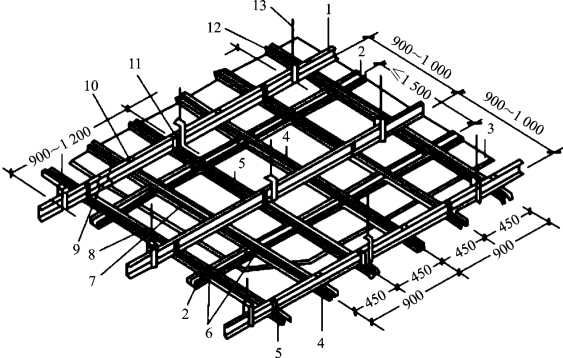 1—BD大龙骨;2—UZ横撑龙骨;3—吊顶板;4—UZ龙骨;5—UX龙骨;6—UZ3支托连接;7—UZ2连接件;8—UX2连接件;9—BD2连接件;10—UZ1吊挂;11—UX1吊挂;12—BD1吊件;13—吊杆φ8~φ10