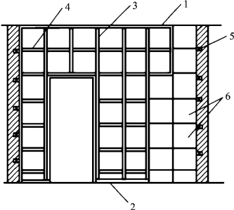 1—上槛;2—槛;3—立筋;4—横撑;5—木砖;6—板材
