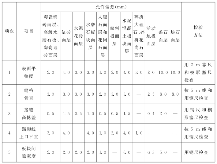 表9.17 板块面层的允许偏差