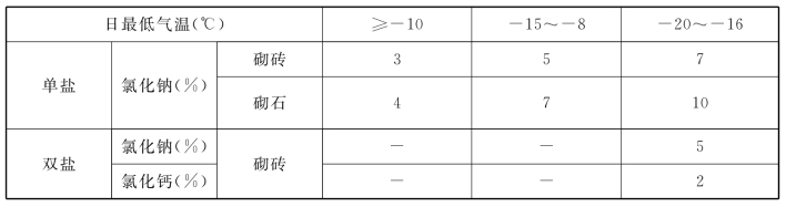 表10.7 砂浆掺盐量(占用水量的百分含量)