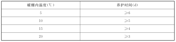 2.砌体在棚内的养护时间,根据暖棚内的温度,应按表10.9确定。