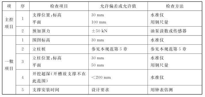 7.5.3 施工过程中应严格控制开挖和支撑的程序及时间,对支撑的位置(包括立柱及立柱桩的位置)、每层开挖深度、预加顶力(如需要时)、钢围囹与围护体或支撑与围囹的密贴度应做周密检查。