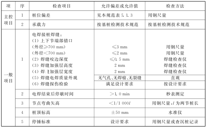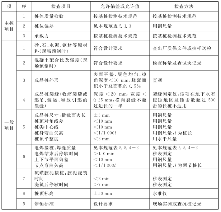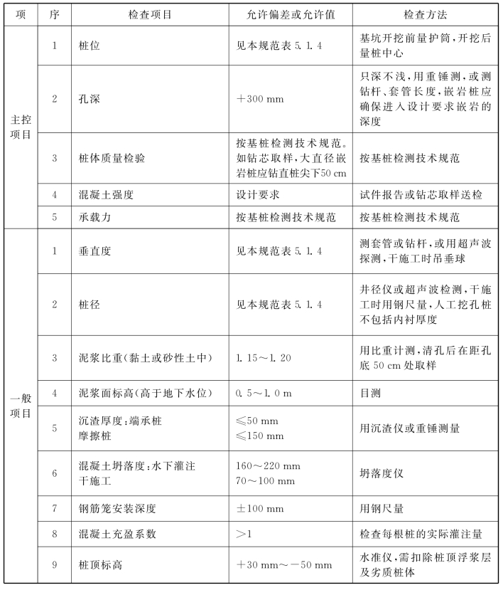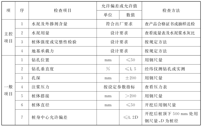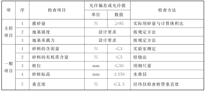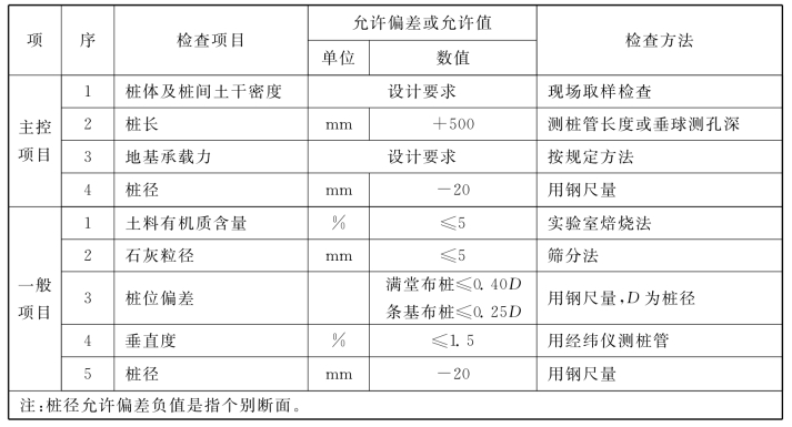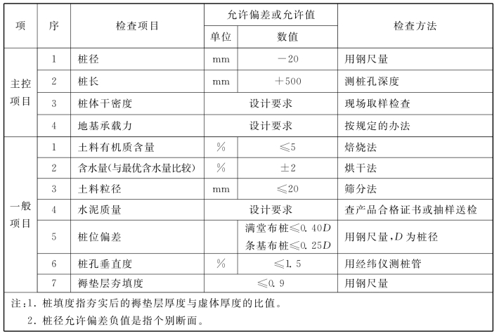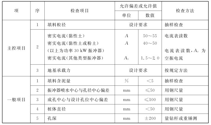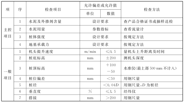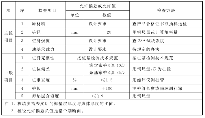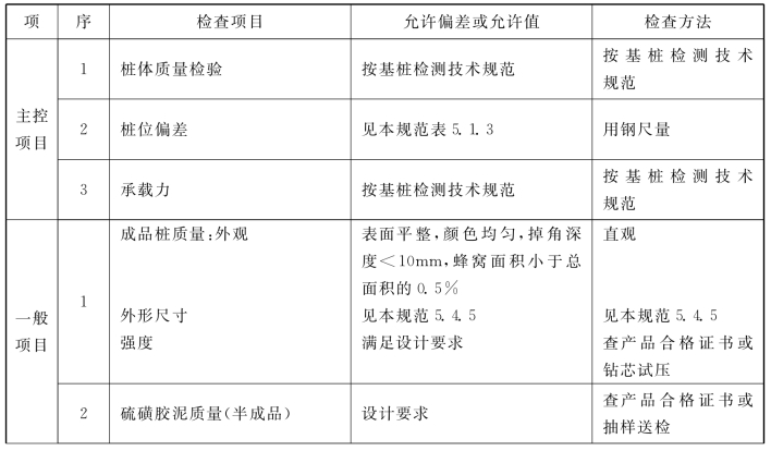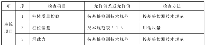 说明:4.1.6 水泥土搅拌桩地基,高压喷射注浆桩地基,砂桩地基,振冲桩地基、土和灰土挤密桩地基、水泥粉煤灰碎石桩地基及夯实水泥土桩地基为复合地基,桩是主要施工对象,首先应检验桩的质量,检查方法可按国家现行行业标准《建筑工程基桩检测技术规范》JGJ106的规定执行。