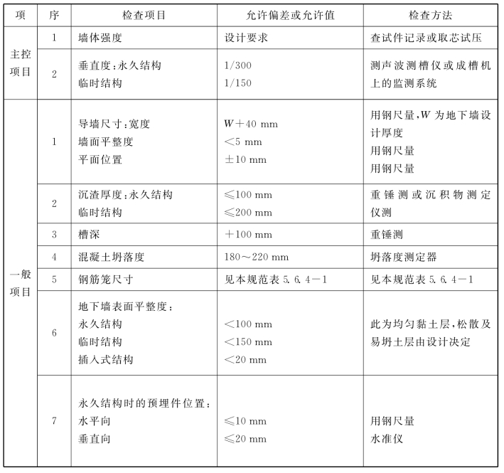 7.6.7 施工中应检查成槽的垂直度、槽底的淤积物厚度、泥浆比重、钢筋笼尺寸、浇筑导管位置、混凝土上升速度、浇筑面标高、地下墙连接面的清洗程度、商品混凝土的坍落度、锁口管或接头箱的拔出时间及速度等。