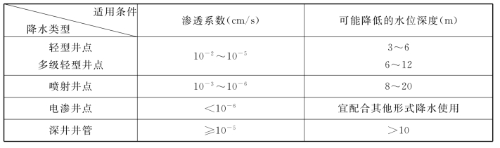 7.8.2 对不同的土质应用不同的降水形式,附表7.8.2为常用的降水形式。