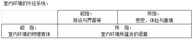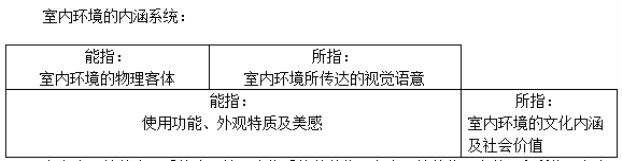 在室内环境的内涵系统中,第一意指系统的能指(室内环境的物理客体)和所指(室内环境所传达的视觉语意)构成第二意指系统的能指(使用功能、外观特质及美感),传达着所指(室内环境的文化内涵及社会价值)。